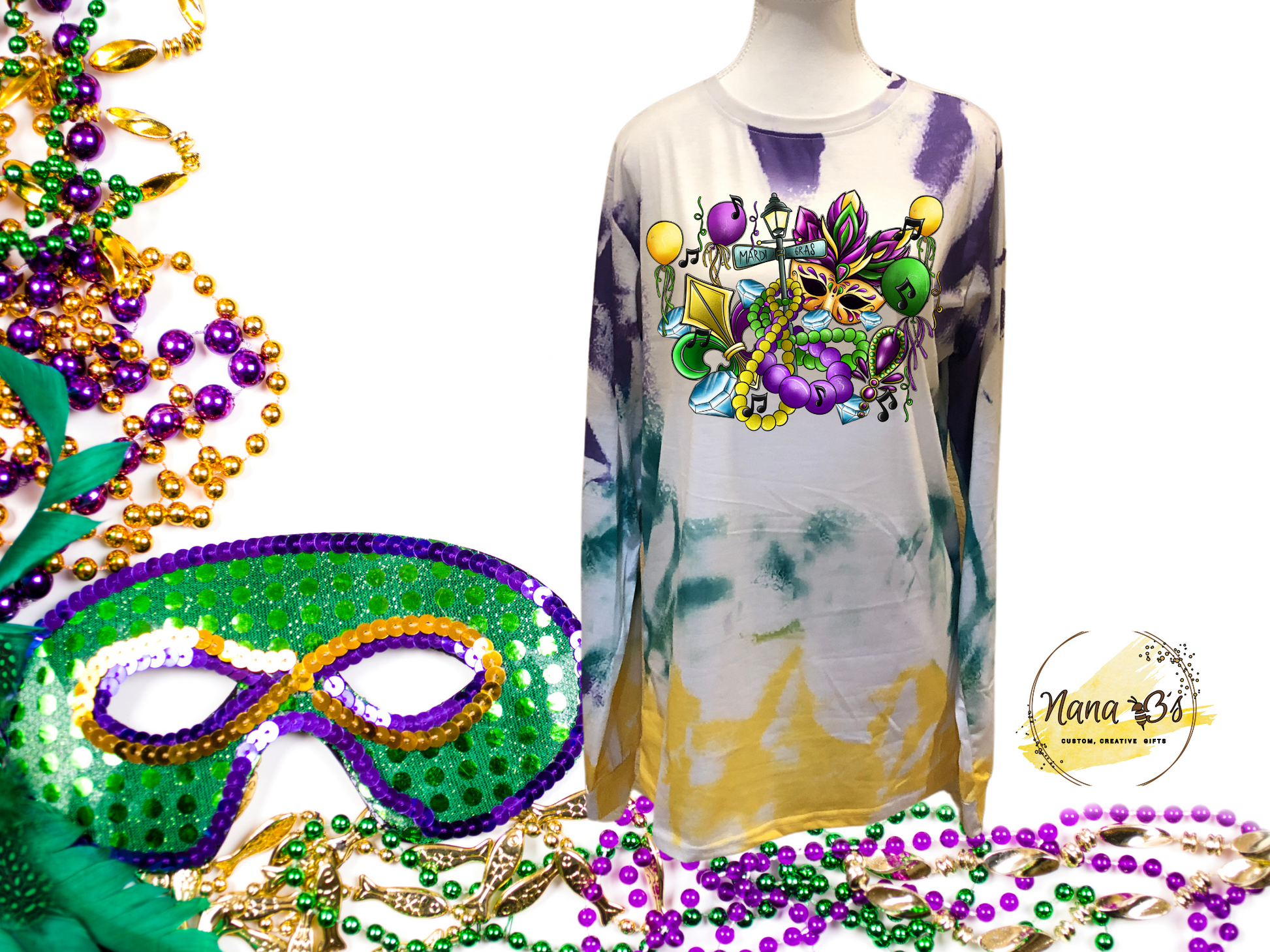 A Mardi Gras tee shirt captures the vibrant spirit of the festive celebration with its lively and intricate design. Using sublimation printing, the shirt features a burst of bold colors, intricate patterns, and iconic Mardi Gras symbols seamlessly blended into the fabric. The long sleeves provide added coverage while allowing the festive design to extend across the entire shirt. This unique and eye-catching garment is a perfect choice for those looking to showcase their love for Mardi Gras in a stylish and comfortable way.